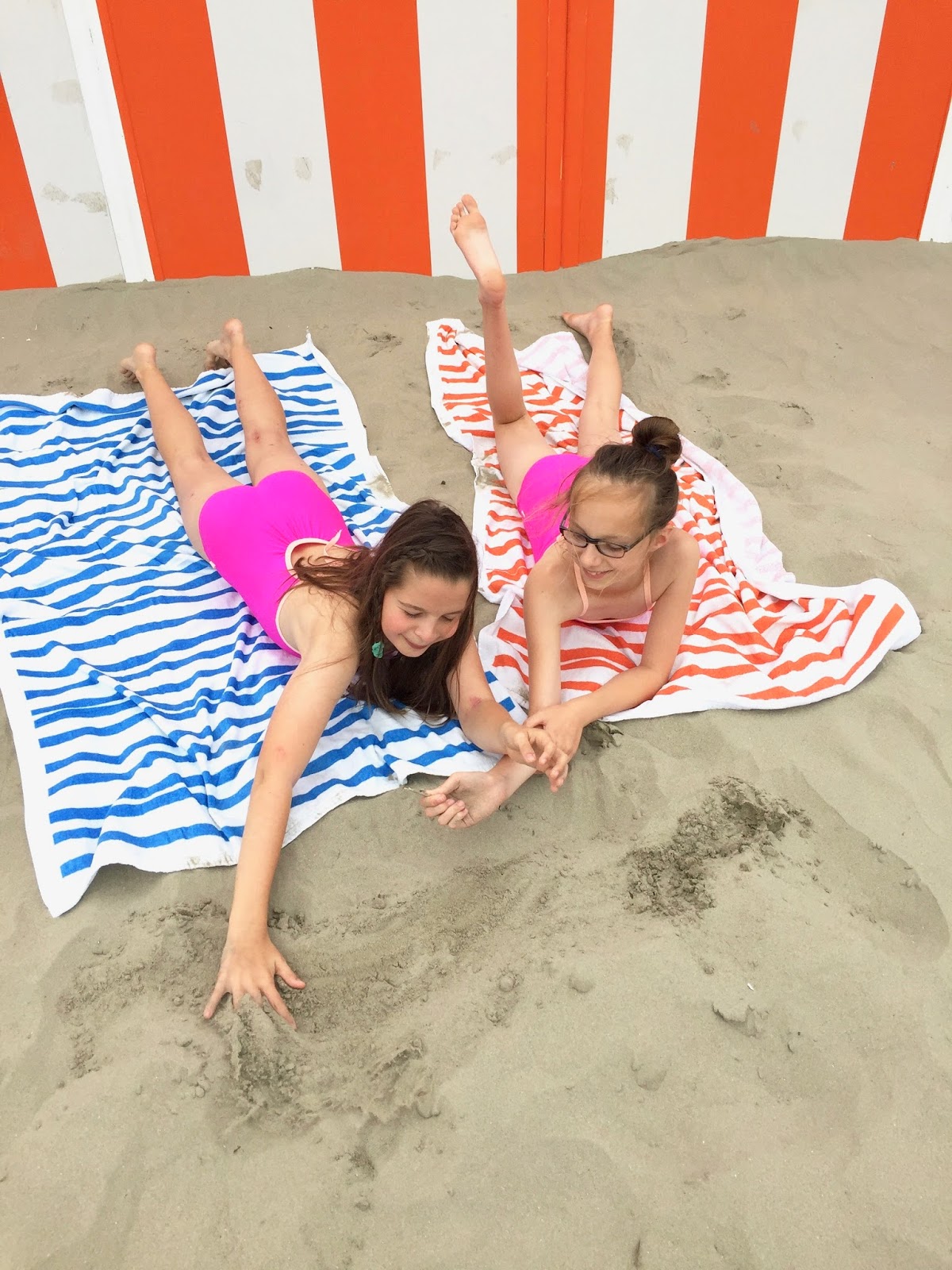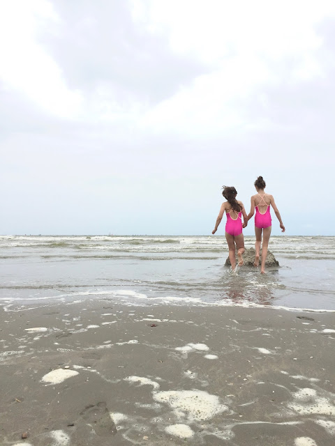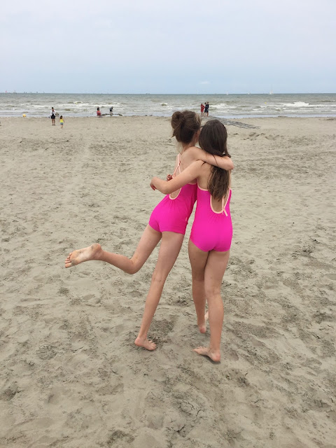 Ik naaide voor Emma en Mona neon-roze badpakken.